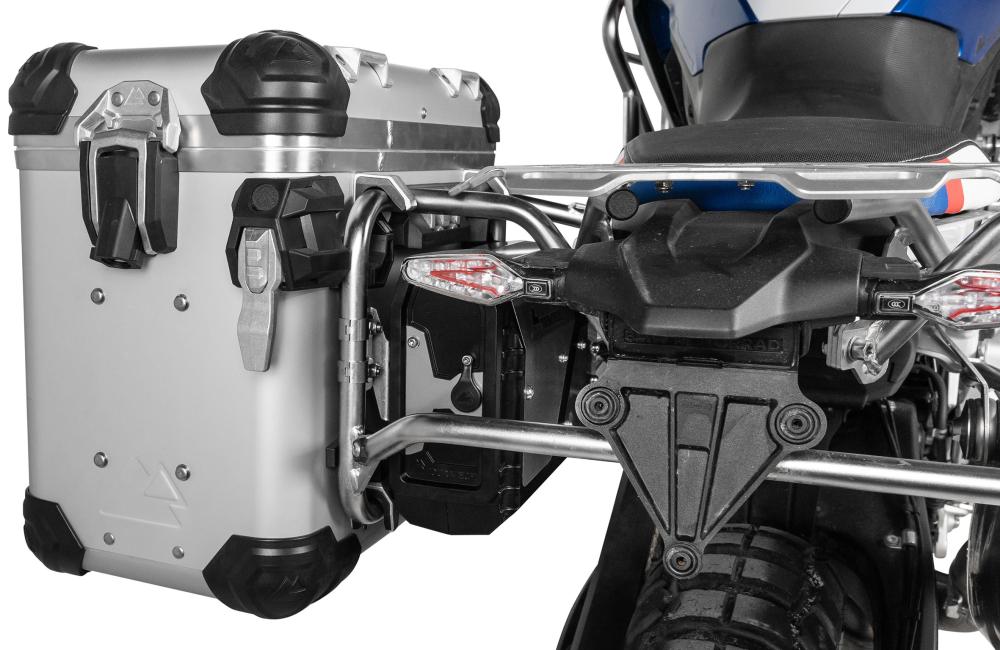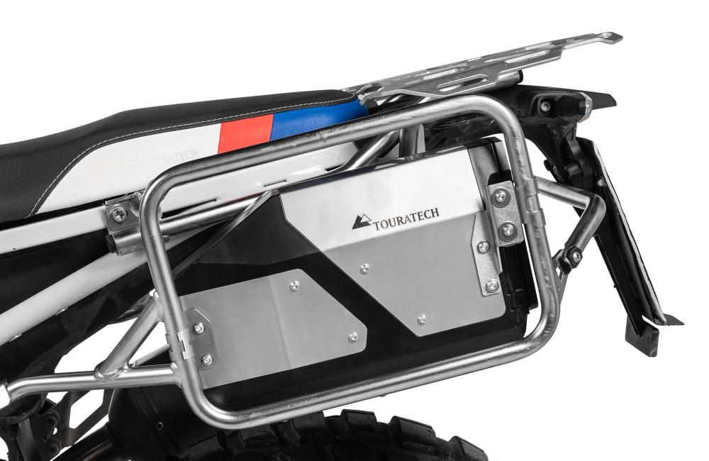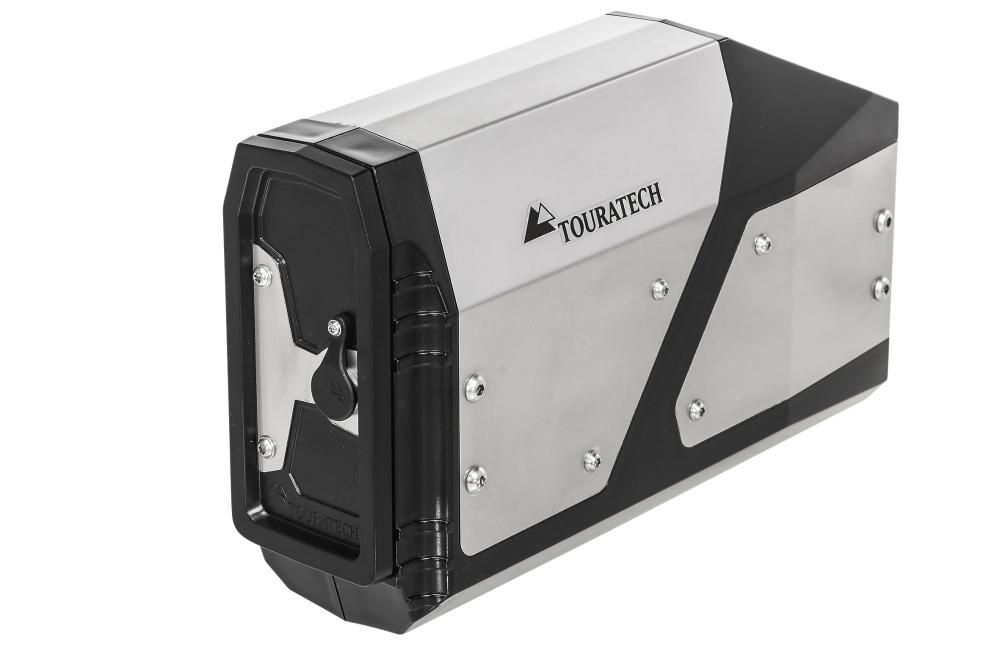 The splashing water-protected design combines a robust plastic housing with high-strength stainless steel mounting elements. It is attached to the Touratech pannier rack using special clamps. The box is compatible with ZEGA Evo panniers and can be used with or without aluminium panniers mounted. Regardless of the configuration, the fully removable, lockable lid, which is secured against loss, always allows convenient access to the contents.